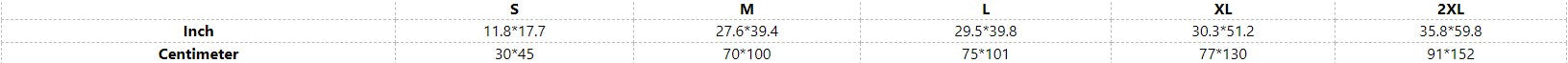 | Centimeter | 30*45 | 70*100 | 75*101 | 77*130 | 91*152 |